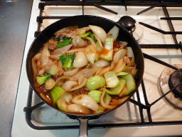玉ねぎが透き通ってきたらチンゲン菜 を加え、ほど良い(?)ところで チキンスープとケチャップで作った 合わせ調味料を加えて3分ほど煮ます |